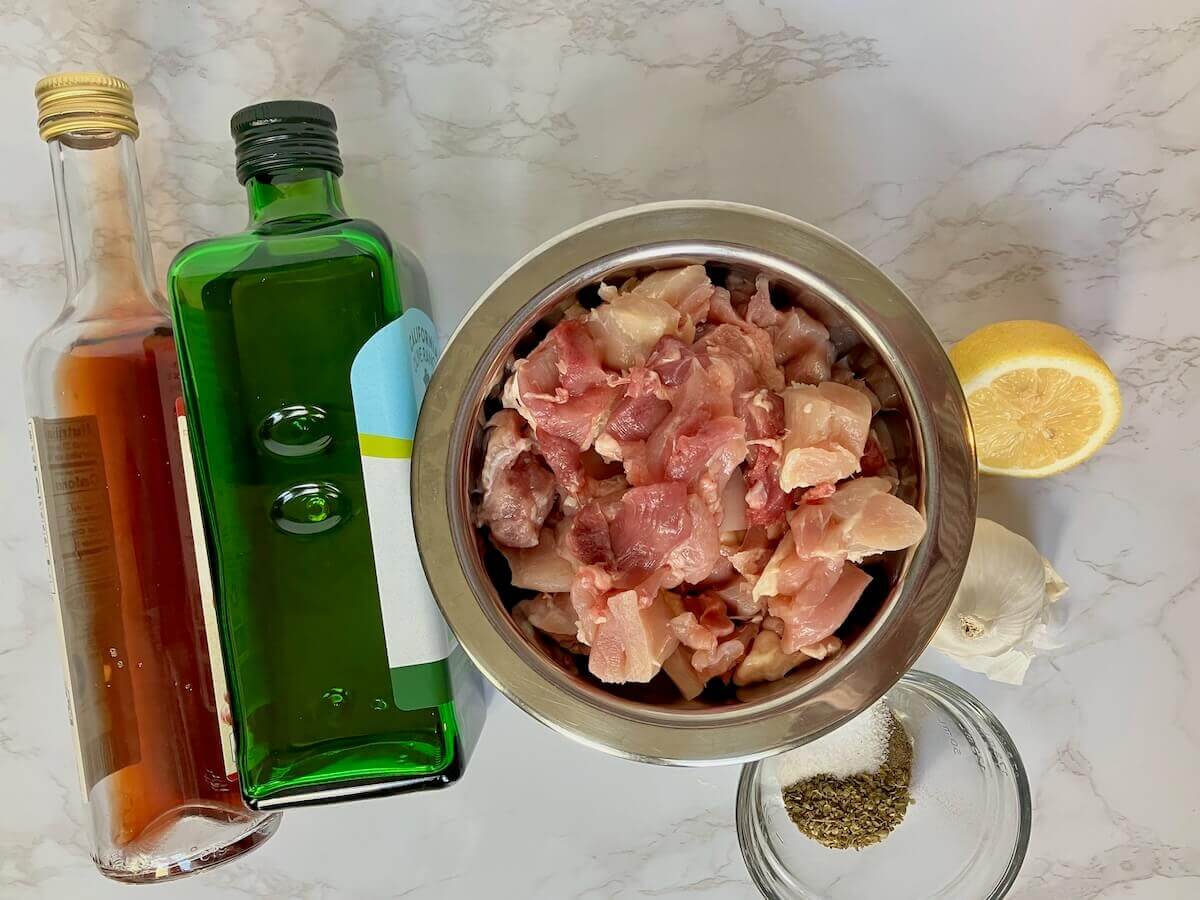 - Cut boneless skinless chicken thighs into bite size pieces and combine in a bowl with garlic, olive oil, lemon juice, salt and oregano. Allow to marinate for 15-20 minutes, while you chop the veggie toppings.