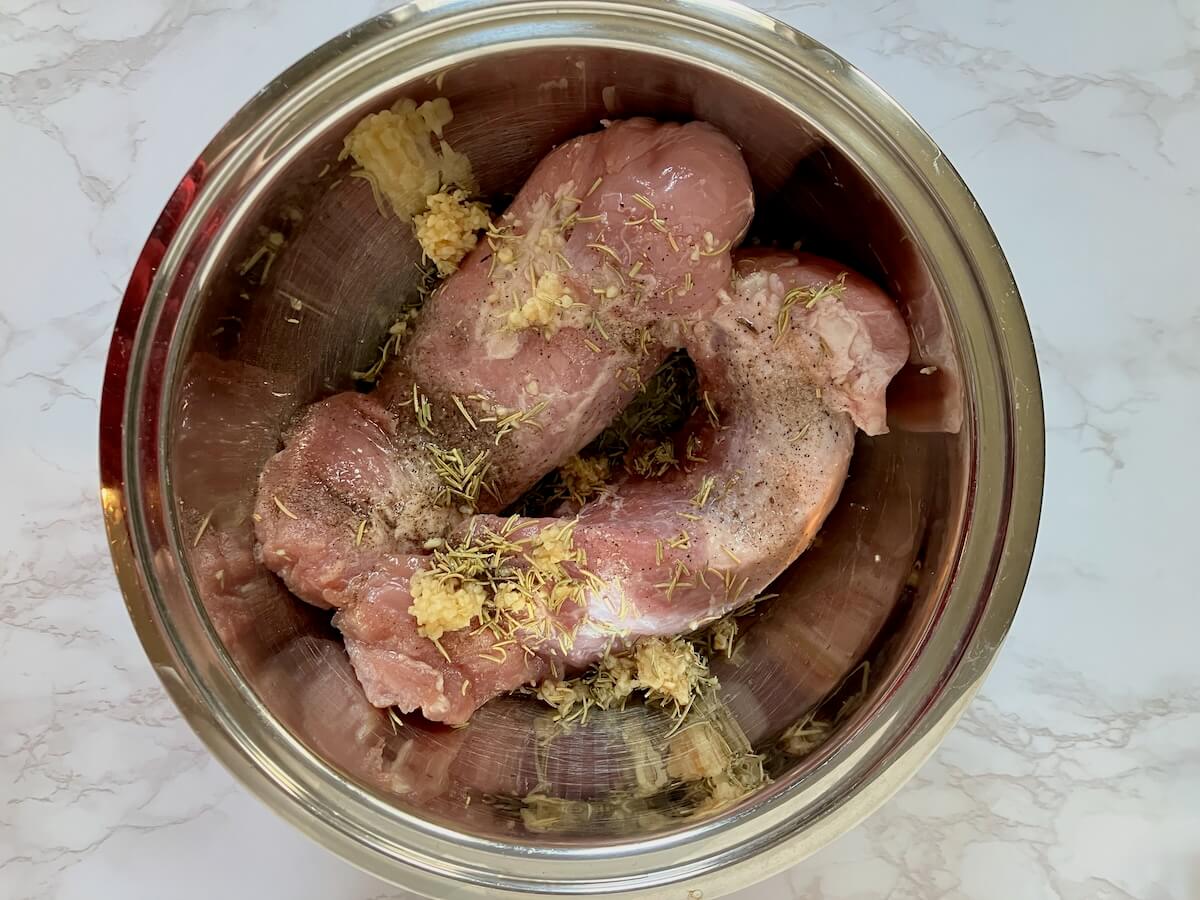Prep extra pork: Most pork tenderloins come in a two pack. If you are only feeding 3-4 people you can probably serve 1 pork tenderloin. If you only plan on cooking one tenderloin, go ahead and marinate both. Then, place one of the tenderloins in a vacuum seal freezer bag and freeze it for later.