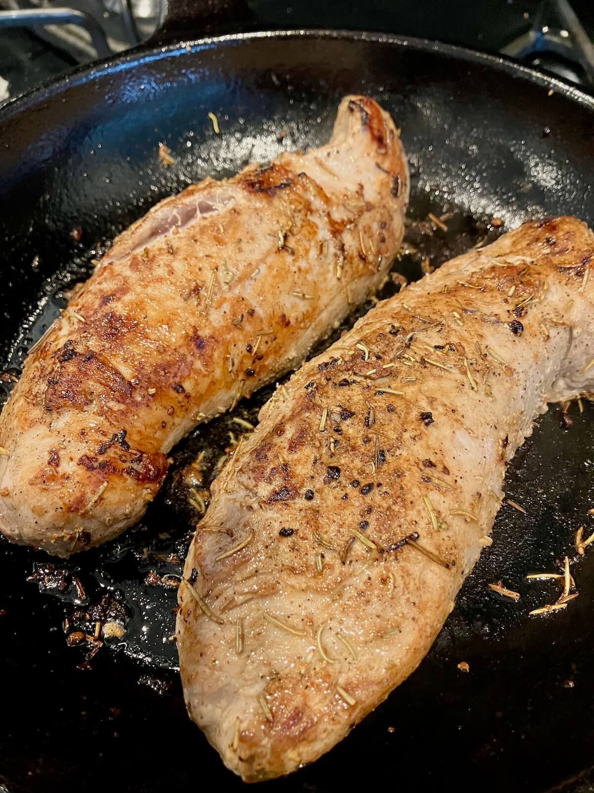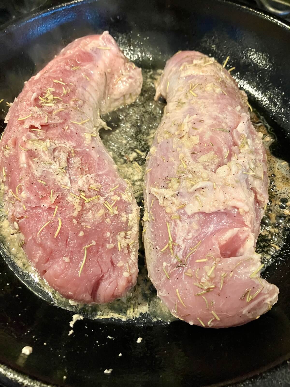 Step Two: Preheat the oven to 450 degrees. Add 1 tablespoon of olive oil and 1 tablespoon of butter to a cast iron skillet (or oven safe skillet) on medium high heat. Place the pork tenderloins on the skillet, laying them away from you to avoid any splatter.